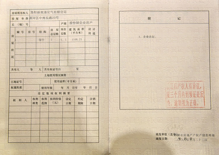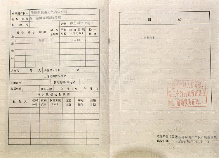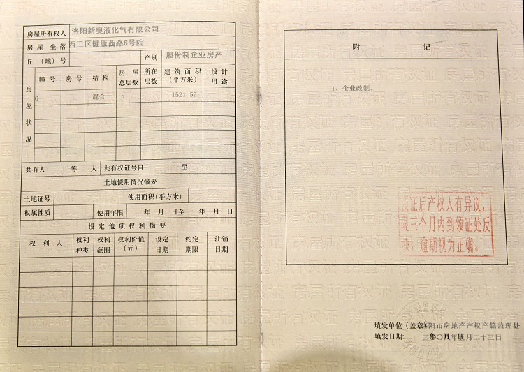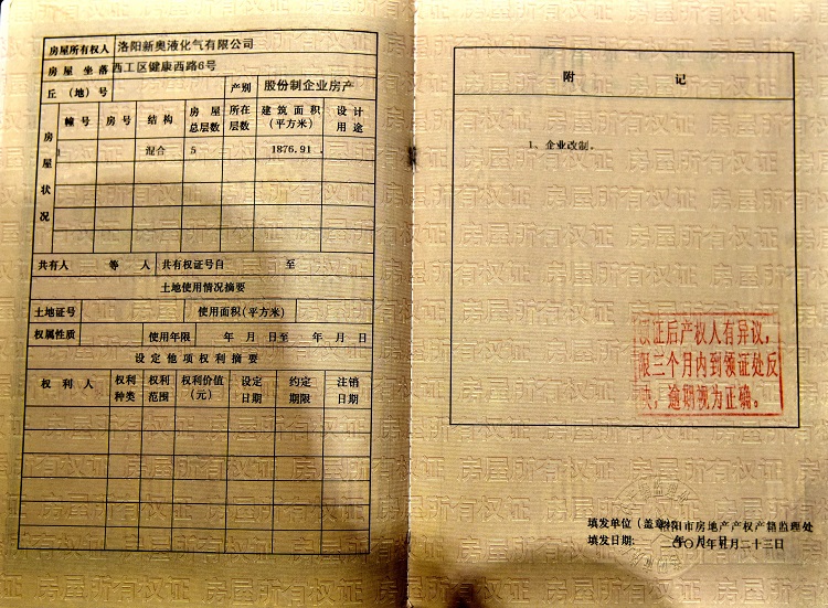 位于洛陽市西工區(qū)健康西路6號院整體房產,原為洛陽新奧液化氣有限公司獨立辦公樓,獨立土地使用證洛市國用(2008)第03008380號,使用權面積1746.5㎡。土地到期年限為2077年12月13日,土地用途為城鎮(zhèn)混合用地。房權證(2008)×443232,證載面積1876.91㎡;房權證(2008)×443233,證載面積1521.57㎡;房權證(2008)×443234,證載面積79.12㎡,總建筑面積3477.6㎡。